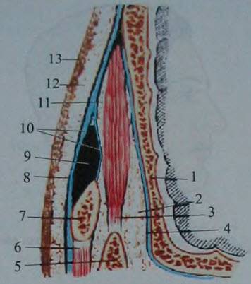 1 — височная кость; 2 — клетчатка позади и впереди височной мышцы; 3 — височная мышца; 4 — надкостница; 5 — венечный отросток нижней челюсти; 6 — жевательная мышца; 7 — скуловая дуга; 8 — межапоневротическая клетчатка; 9 — собственная фасция; 10 — подкожная флегмона; 11- поверхностная фасция; 12 — кожа.