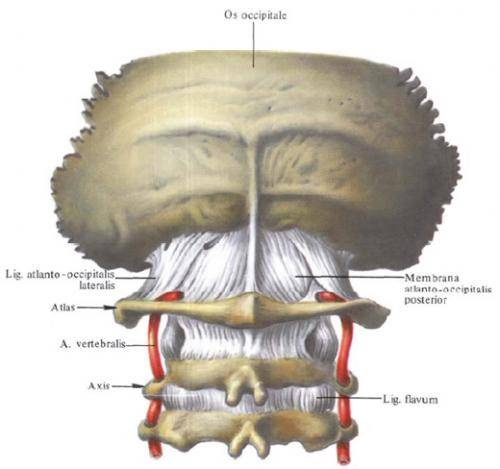 Желтые связки отсутствуют между дугами атланта и осевого позвонка. Здесь натянута покровная мембрана, которая своим передним краем ограничивает сзади межпозвоночное отверстие, через которое выходит второй шейный нерв.