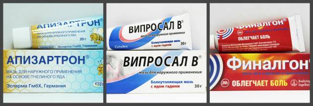 Наряду с препаратами для внутреннего применения, назначаются медикаменты для наружного использования в форме мазей и гелей. Данные средства содержат нестероидный противовоспалительный и обезболивающий компонент. К таким препаратам относятся Фастум гель, Диклофенак в форме геля, Ибупрофеновая мазь, Вольтарен гель, Долобене. Мази с согревающим и местнораздражающим эффектом содержат метилсалицилат, ментол, диметилсульфоксид, змеиный яд, пчелиный яд, никобоксил, нонивамид. Это Капсикам, Финалгон, Випросал, Апифор, Бом-Бенге.