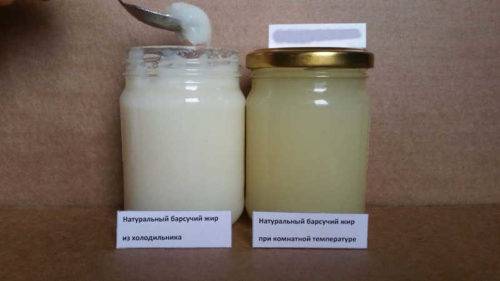 - в отличие от бараньего, при низкой температуре (- 10 °С и ниже) барсучий жир до твердого состояния не застывает, а лишь становится более густым;