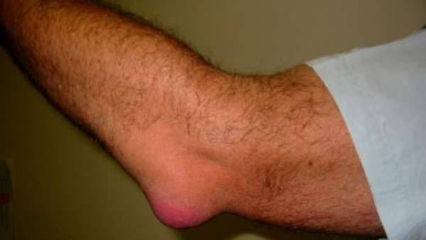 - Основным признаком бурсита является отчетливость опухоли на сгибе локтя. При давлении или прощупывании появляется боль. Шишка краснеет, ощущается, что она горячая. Движения сковываются. При гнойном течении появляются боли в голове, мышечная ломота, тошнота с рвотой.