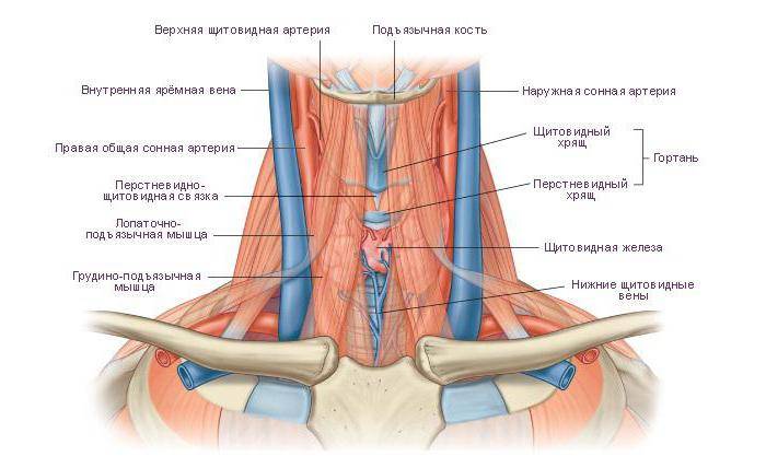 - Апоневроз лопаточно-ключичный – выглядит подобно трапеции и располагается между боковых сторон лопаточно-подъязычной мышцы и подъязычной кости, а снизу делит пространство между поверхностью грудины изнутри и двумя ключицами. Он покрывает переднюю часть гортани, щитовидную железу и трахею. По средней линии шеи лопаточно-ключичный апоневроз срастается с собственной фасцией, образуя белую линию.