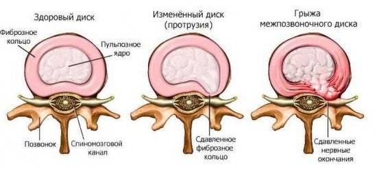 Возникновение грыжи межпозвонковых дисков – в этом случае речь идет о разрушении межпозвоночного сегмента с последующим выдавливанием его пульпозного ядра наружу. Это приводит к ущемлению нервов и вызывает сильные боли, усиливающиеся при движениях