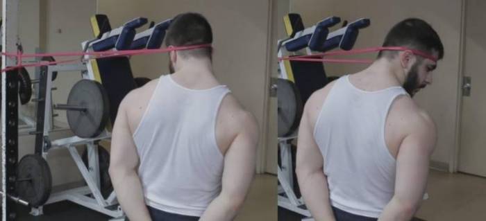 Упражнения на специальном тренажере для мышц шеи. Очевидное преимущество блочного тренажера в заранее заданной амплитуде и равномерной нагрузке — ее не надо контролировать, а значит, можно полностью сосредоточиться на выполнении упражнения. Если в зале нет специального оборудования, в ход пойдут любые подручные средства (резинка, эспандер).
