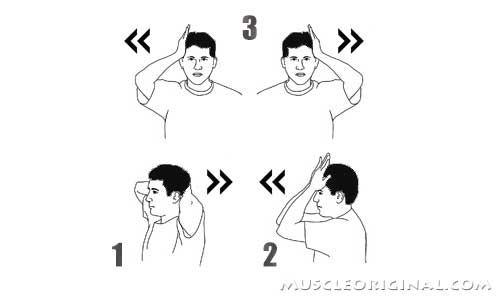 - Для боковых частей шеи – упор ладонью в височную часть головы, преодолевая усилие руки с помощью мышц шеи, наклоняем шею вправо или влево в зависимости от стороны приложения силы.