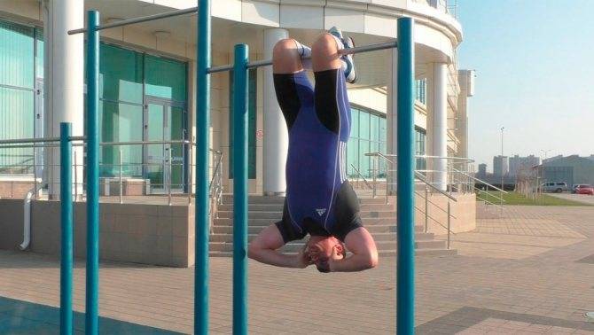Прокачка пресса в висе на перекладине вниз головой считается очень сложным элементом, но качественно прокачивающим все мускулы тела.