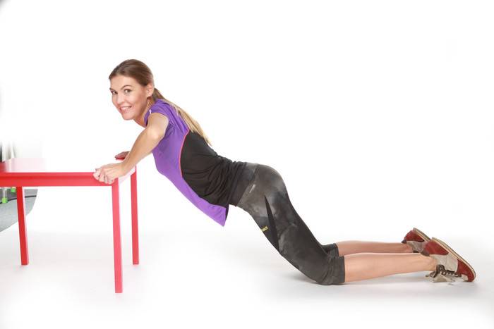 Походите на ягодицах вперед и назад. Просто сядьте на пол, вытянув перед собой ноги, и пошли! Самые тренированные могут попробовать усложненную версию: ноги приподнять над полом и походить на ягодицах.