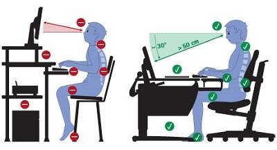 Для предупреждения заболеваний спины необходимо организовать правильное рабочее место для учебы ребенка. Высота стола и стула должна соответствовать росту. Во время работы за столом, ступни полностью расположены на полу, ноги согнуты в коленях под прямым углом, руки при опоре на стол находятся под прямым углом к туловищу. При отсутствии возможности отрегулировать высоту стола и стула, применяют подставки под ноги и подушки под ягодицы ребенка. Необходимо следить, чтобы источник естественного и искусственного света падал с левой стороны, ребенок не сутулился и не наклонялся близко к столу.