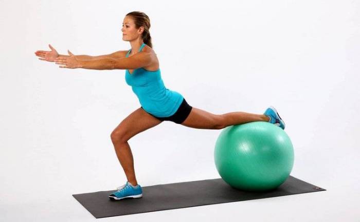 Выпады с мячом — это силовое упражнение с фитболом, прорабатывающее ноги, поясницу и грудной отдел. При выполнении таких тренировок нужно следить за правильным положением опорной ноги, колено которой не должно выходить за уровень носка.