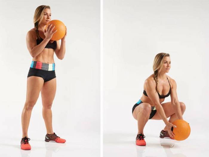 Чрезвычайно эффективное упражнение — приседание у стены, когда мяч поддерживает спину, перемещаясь от поясницы до уровня плеч. Первоначально выполнять такие тренировки будет проблематично, поэтому сначала рекомендуется делать не более трех—четырех повторений в три подхода, в последующем увеличивая интенсивность занятий.