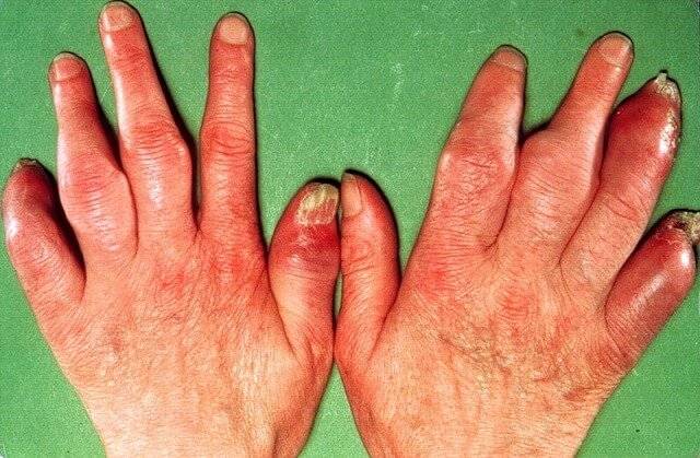 - В первом случае поражаются кости, суставы и мягкие ткани пальцев рук и стоп, что приводит к образованию их сосискообразной формы.