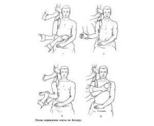 Важно контролировать позу пострадавшего и следить за тем, чтобы край кушетки проходил под подмышечной впадиной, а рука свисала вниз. После этого больного оставляют лежать примерно 20 минут в таком положении