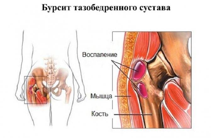 Воспаление вертельной сумки, которая размещается над выступом бедренной кости, также называют бурситом. Для данного заболевания характерны болевые ощущения в наружном отделе области ягодиц. Если больной ложится на пораженный бок, боль в тазобедренном суставе резко усиливается. Бывают случаи воспалительных процессов и в других жидкостных сумках сустава, однако вертельная сумка повреждается гораздо чаще.