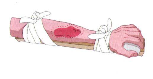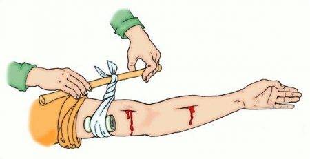 - наложение жгута — при сильном кровотечении, грозящем обильной кровопотерей накладывается жгут выше раны. К жгуту прикладывается записка с точным временем наложения;
