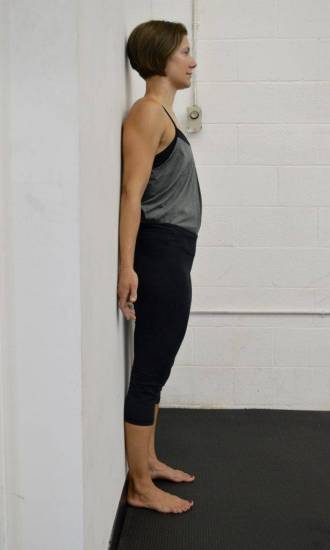 Самая частая ошибка заключается в том, что выполняющий упражнение пытается всеми силами вжаться в стену. Из-за этого вес перемещается на мыски, а пятки отрываются от пола. Проверьте все точки прикосновения и коснитесь последней точкой – затылком.