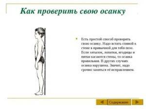 Достаточно лёгкое домашнее задание, показывающее, как проверить правильность осанки – постоять в таком положении у стены для того, чтобы мышцы «запомнили» правильное положение.