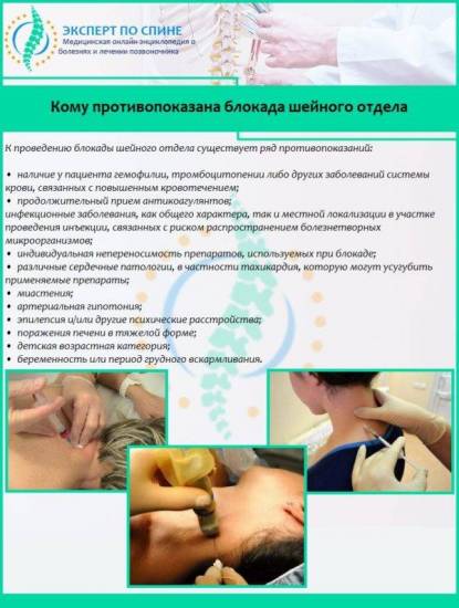 В некоторых источниках можно увидеть информацию о том, что блокада позвоночника – простая и безопасная процедура, не требующая специальных знаний и навыков. Это не так. Паравертебральная или вагосимпатическая блокада шейного отдела – это сложные нейрохирургические манипуляции, выполнять которые может только квалифицированный специалист при наличии подходящих для этого условий. Как и любая другая микрохирургическая манипуляция, шейная блокада имеет ряд противопоказаний, к которым относятся: