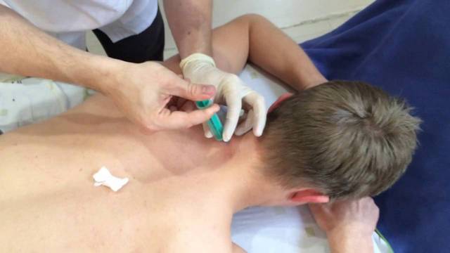 - Подготовительный этап. Пациент ложится на живот, а специалист пальпаторно определяет участок наибольшей болезненности. Это место смазывают антисептическим средством и проводят местную анестезию.