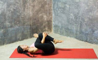 Лягте на пол. Согните оба колена. Скрестите правую ногу над левой, чтобы правая лодыжка касалась левого колена. Затем, сцепив пальцы рук под левым коленом, медленно потяните его к груди. Почувствуйте натяжение в области правой ягодицы,задержитесь в этом положении на 3 минуты. Затем выполните это упражнение для левой ноги.