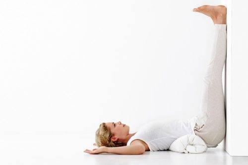 Лягте на пол, перпендикулярно стене, чтобы ваши ягодицы в нее упирались. Поднимите ноги, выпрямите их и облокотите на стену. Почувствуйте расслабление нижней части спины и верхней части бедер. Для удобства можно сгибать колени и голеностопные суставы, а также подложить маленькую подушку или свернутое одеяло под поясничный отдел позвоночника.