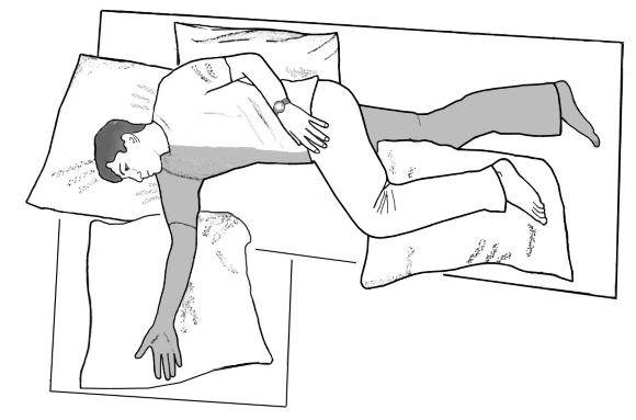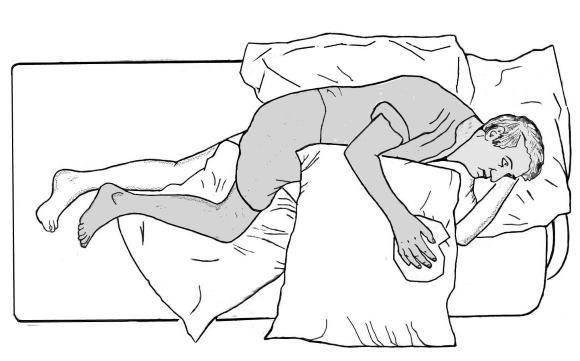 - На здоровом боку. Рука согнута в локтевом и плечевом суставах, нога – в тазобедренном и коленном. Под конечности подложены подушки.