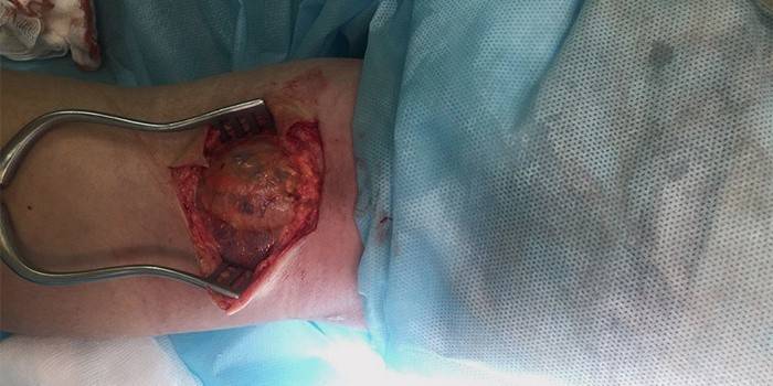Суть вмешательства состоит в иссечении кисты и пережатии канала, связующего ее с синовиальной капсулой сустава. Затем рана обрабатывается антисептическими растворами и зашивается.
