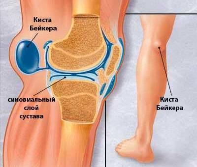 Киста Бейкера располагается в месте прикрепления сухожилий полупоперечной и икроножной мышц. Между ними в подколенной ямке есть межсуставная сумка, где и накапливается жидкость из воспаленного околосуставного пространства.