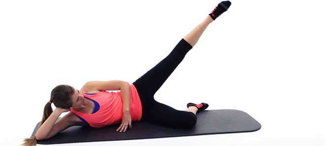 Лечь на бок, вытянуть ноги, положить их одна на другую. Одну руку вытянуть вдоль туловища, на другую сделать упор. Делать подъем верхней ноги, не дотрагиваясь до другой. Сделать 3 повторения по 15 раз.