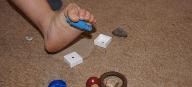 - захватывание и перемещение пальчиками ног мелких предметов (шарики, кубики, карандаши);