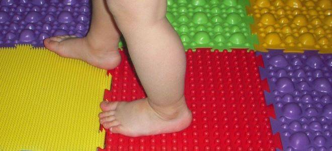 В домашних условиях отличным лечебно-профилактическим методом при плоскостопии является хождение по специальному коврику, поверхность которого имитирует рельефы гальки разной величины и травы, покрыта небольшими массирующими шипами. Изготавливается такой коврик от плоскостопия для детей из вспененного полимера и представляет собой набор из нескольких квадратных деталей, которые соединяются в виде дорожки, змейки либо в форме прямоугольника. Ортопедический коврик вполне способен заменить ковровое покрытие в детской комнате, что обеспечит регулярный массаж ножек.