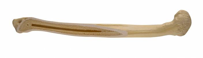 Трёхгранная локтевая косточка — более объёмная и мощная, нежели лучевая. На верхнем конце она имеет значительное утолщение с блоковидной вырезкой, к которой плотно примыкает плечевая кость, как бы охватывая её. Латеральный край, соответственно, примыкает к лучевой кости.