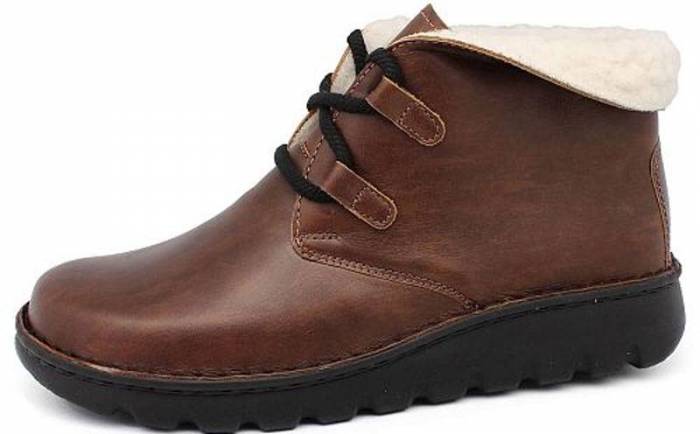 Модель выполнена из натуральной кожи снаружи и шерсти внутри. При производстве соблюдены все ортопедические стандарты: правильная колодка, широкий носок, усиленный задник. Подошва выполнена из полиуретана и обладает выраженными амортизационными свойствами.