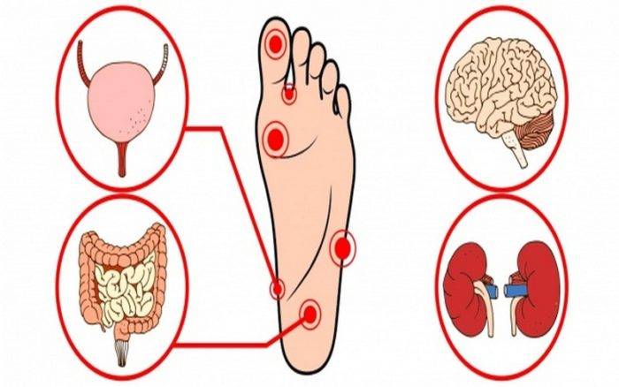 Ноги применяют не только для прогулок, но и для улучшения обмена веществ и здоровья в целом. Массаж каждого участка, изображенного на рисунке, положительно влияет на работу пищеварительного отдела.