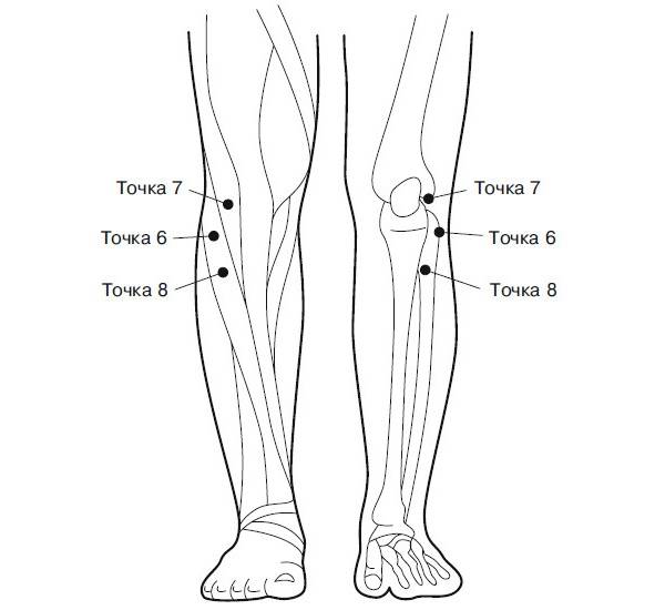 - перед головкой берцовой кости (снимает гипертонус мышц и суставные боли колена);