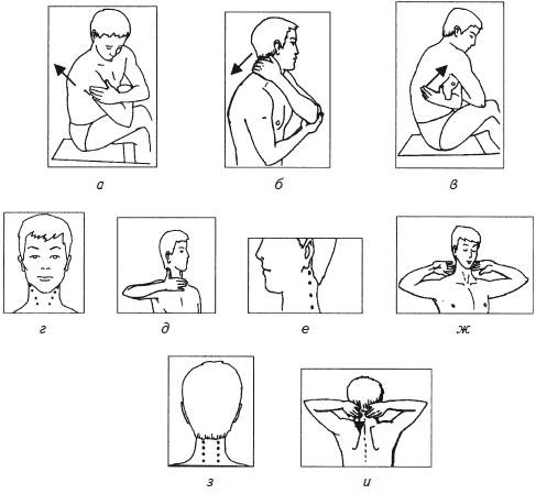 Активные точки в плечевом поясе расположены над лопатками и в верхней части позвоночника. В данном случае принцип воздействия такой же, как и в предыдущем, — сначала нужно тщательно подготовить мышцы плечевого пояса, разогреть их и расслабить. Для этого подойдут поглаживающие движения, причем поглаживать нужно всю спину, а не только ее часть. После подготовки нужно в течение 10 секунд надавливать на точки, а затем сделать круговые движения (при этом рекомендуется прикладывать небольшие усилия).