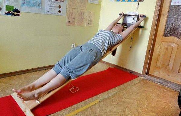 Терапию межпозвонковой грыжи эффективно дополняют простым способом растяжения. Для выполнения методики вытяжения разработаны специальные столы и тренажеры. С их помощью создается оптимальное положение для восстановления правильного положения диска.
