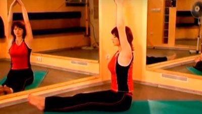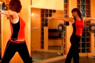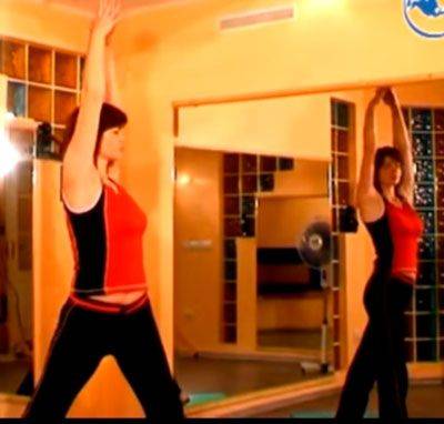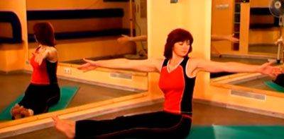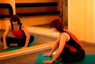 Постановка ног та же, а руки согнуты в локтевом суставе и поставлены на уровне подбородка. Туловище поворачивать в стороны, таз остается в исходном положении. Повторять 20 раз.