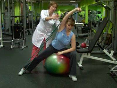 1.Сядьте на фитбол. Специальную резиновую ленту сверните вдвое и накиньте одним концом на правую стопу, а ногу отставьте в сторону. Второй конец ленты зажмите в правой руке. Локтем левой руки обопритесь на левое колено. На выдохе правая рука выпрямляется вверх по диагонали. Сделайте 15–20 повторов обеими руками.