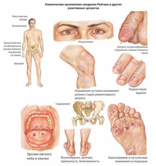 - синдром Рейтера, когда воспаляются суставы, слизистая оболочка и мочеиспускательный канал;