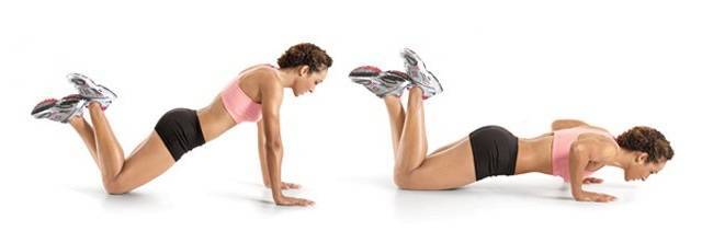 1. Отжимание с колен. Этот способ является облегченным вариантом с минимальной нагрузкой. Очень подходит для женщин и детей, а, также, после различных травм и болезней.