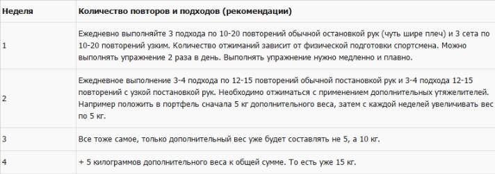 Неделя первая, подготовительная.1. тренировка: 20, 20, 20, 20, 20 (пять подходов по 20 отжиманий). Плюс два подхода отжимания от стула (садимся на стул, затем выдвигаем ноги вперед, а руки ставим на край сиденья) по 15 раз.2 тренировка: 25, 25, 25, 25, 253 тренировка: 30, 35, 40, 35, 20