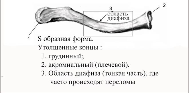 Один конец ключицы (медиальный) соединён с грудной костью, или грудиной, образуя грудино-ключичный сустав; другой (акромиальный) — сочленяется с концом лопаточной кости, или акромионом, формируя акромиально-ключичный сустав. Соединение ключицы с грудью и лопатками поддерживается в том числе благодаря креплению связочного аппарата. Форма ключицы в срединном конце — закруглена, а в латеральном (дальнем) — уплощается. Ввиду особенностей своей конструкции ключица довольно часто подвержена переломам.