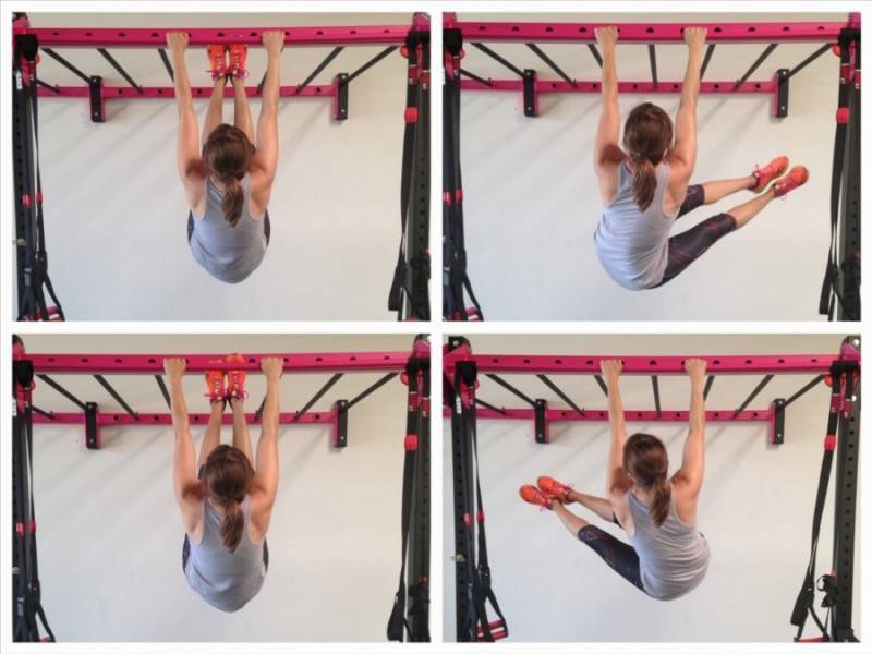 - С выдохом подтягиваемся так, чтобы бёдра оказались на уровне перекладины.