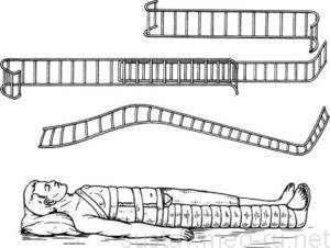 Шина Крамера – это лестничная конструкция из проволоки, обмотанной марлей. Для полноценной иммобилизации необходимо две шины. Одна применяется на наружную боковую поверхность ноги, а вторая – на внутреннюю поверхность и стопу. Фиксация происходит бинтованием вокруг обеих шин.