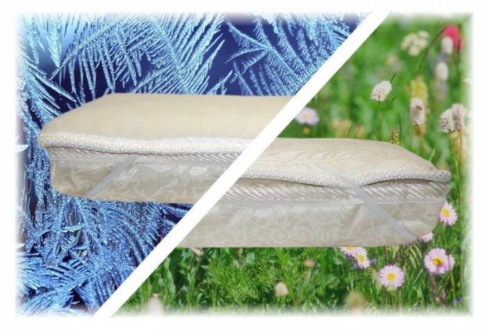 На теплой стороне находится шерсть, намного реже встречается войлок, натуральный латекс, искусственный латекс или другие мягкие наполнители. Способствуют быстрому выводу влаги, долговечны, характеризуются наличием ортопедического эффекта. К недостаткам следует отнести высокую стоимость продукта. В бюджетных моделях латекс заменен на пенополиуретан. В жаркую погоду выбирают летнюю сторону, поверхность которой покрыта хлопком, или другими дышащими натуральными тканями. Только таким образом можно обеспечить необходимый воздухообмен, в котором нуждается кожа. Наполнитель не обязательно будет мягким. Использоваться может кокосовое волокно.