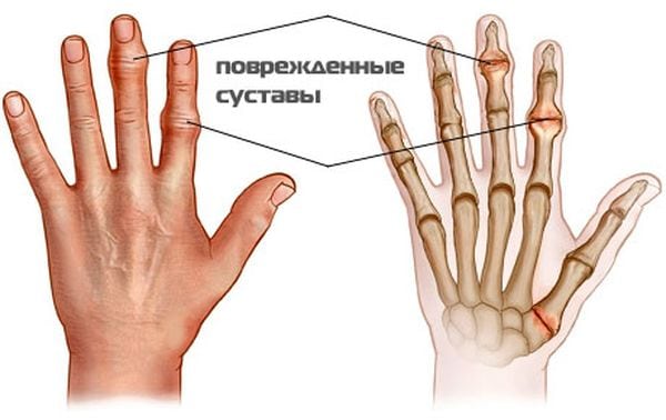 - поражение острым или хроническим воспалительным процессом проксимальных, межфаланговых, плюснефаланговых, лучезапястных суставов пальцев рук;