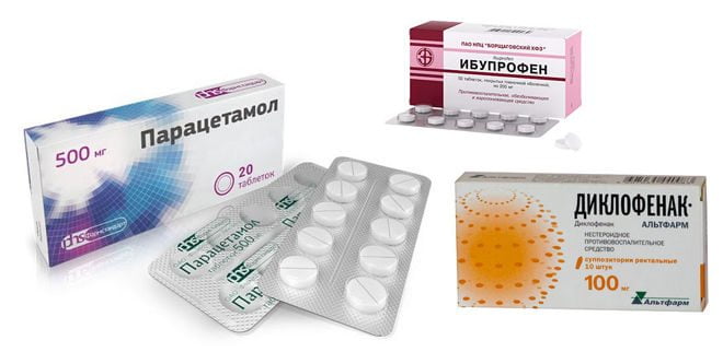 При обезболивании и устранении воспалительной реакции врачи назначают наиболее известные препараты нестероидной противовоспалительной активности – Диклофенак, Ибупрофен или Парацетамол.