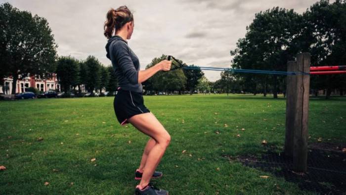 - Жгут зафиксировать за какой-нибудь столб (палку, дерево). Стоим (ноги чуть согнуты) со взятым в руки концами ленты. Руки сгибаем в локтях, на выдохе тянем их к подбородку (см. картинку). Сделать 10-15 раз.