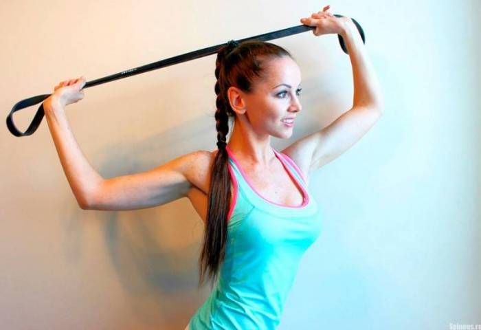 - Стоим, берем концы резиновой ленты в руки. На образовавшуюся петлю встаем двумя ногами так, чтобы они находились на ширине плеч. Руки отводим в стороны, локти не сгибаем. На выдохе поднимаем прямые руки вверх, на вдохе — опускаем. Делаем 10-15 раз.