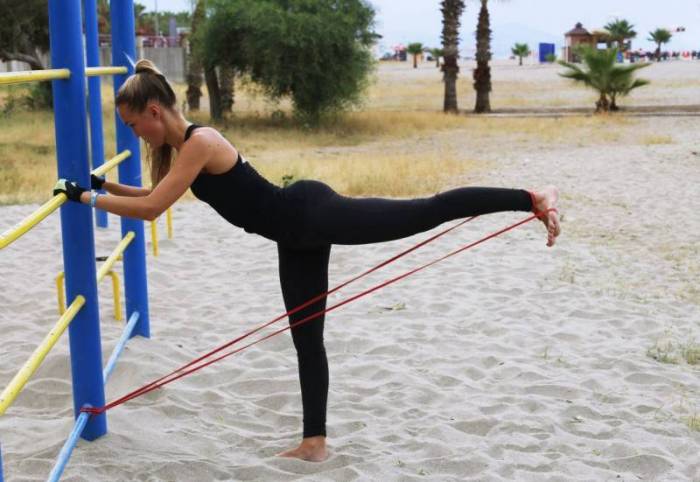 - Привязываем жгут к ноге (возле лодыжки), другой конец жгута — к ножке шкафа. Отходим, натягивая ленту. Встаем таким образом, чтобы опора, где привязан жгут, была позади вас. Тянем ногу 20 раз. Затем повторяем те же манипуляции с другой ногой.
